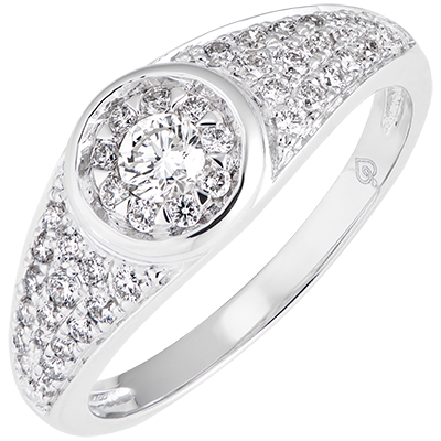 Ein besetzter Rahmen, welcher durch einen zentralen Diamanten mit Halo Umrandung verziert wird. Dieser Verlobungsring entspricht alle klassischen Regeln der Juwelierskunst. 46 Diamanten : 0.47 Karat - Weißgold (375/-): 2.6 g. Pavé aus natürlichen Diamanten : 46 - Weitere Abmessungen