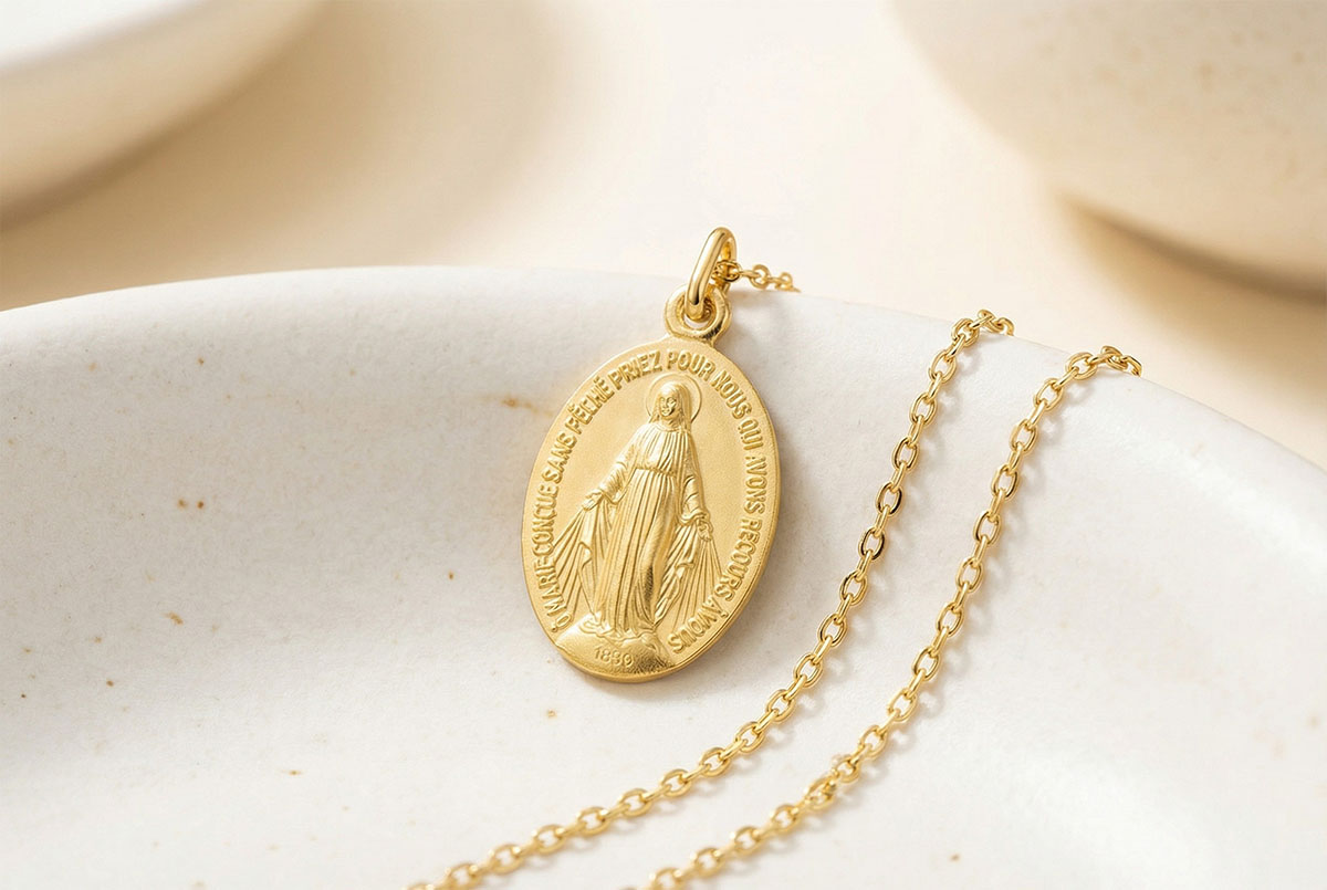 Diese wundertätige Medaille aus Gelbgold zeigt die Jungfrau Maria mit offenen Armen, bereit, ihre Gnaden denen zu schenken, die um ihren Schutz bitten. Die Inschrift "O Maria, ohne Sünde empfangen, bitte für uns, die wir zu dir unsere Zuflucht nehmen" umrahmt das Bild und verstärkt die Wohlwollen und spirituelle Kraft dieser Medaille. Auf der Rückseite sind das Symbol "M" mit dem Kreuz, darüber zwei Herzen (das heilige Herz Jesu und das unbefleckte Herz Mariens), von zwölf Sternen umgeben, die traditionellen Symbole des christlichen Glaubens wiedergeben. Eine schützende Medaille, ideal für eine Taufe, Kommunion oder jeden bedeutsamen spirituellen Anlass.