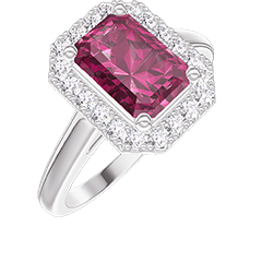Ring Weißgold 750/-(18Kt) - Synthetischer Rubin Rechteckig 1 Karat - Halo Labordiamant