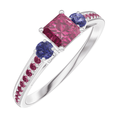 « L'ATELIER » NR. 160772Ring Weißgold 375/-(9Kt) - Rubin Prinzess 0.3 Karat - Seitliche Steine Blauer Saphir - Fassung Rubin