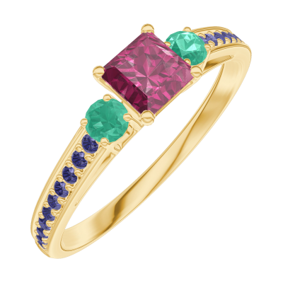 « L'ATELIER » Nº160794Ring Gelbgold 375/-(9Kt) - Rubin Prinzess 0.3 Karat - Seitliche Steine Smaragd - Fassung Blauer Saphir