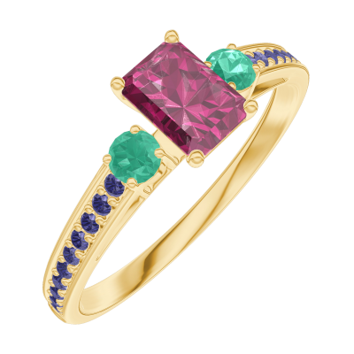 « L'ATELIER » Nº160894Ring Gelbgold 375/-(9Kt) - Rubin Rechteckig 0.3 Karat - Seitliche Steine Smaragd - Fassung Blauer Saphir