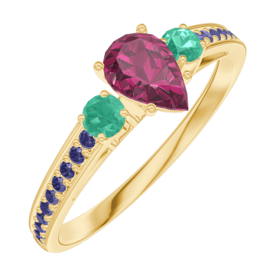 « L'ATELIER » Nº161094Ring Gelbgold 375/-(9Kt) - Rubin Tropfen 0.3 Karat - Seitliche Steine Smaragd - Fassung Blauer Saphir