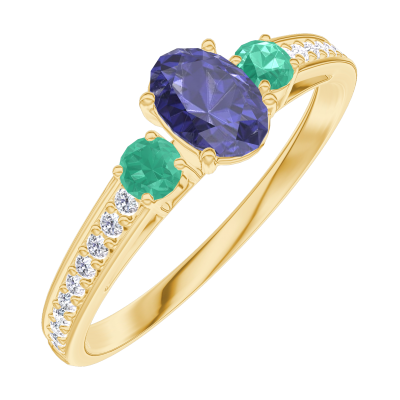 « L'ATELIER » Nº161586Ring Gelbgold 375/-(9Kt) - Blauer Saphir Oval 0.3 Karat - Seitliche Steine Smaragd - Fassung Diamant 5