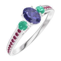Ring Weißgold 750/-(18Kt) - Blauer Saphir Oval 0.3 Karat - Seitliche Steine Smaragd - Fassung Rubin