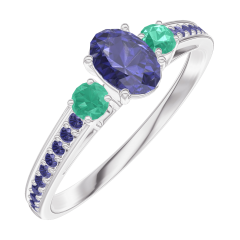 Ring Weißgold 375/-(9Kt) - Blauer Saphir Oval 0.3 Karat - Seitliche Steine Smaragd - Fassung Blauer Saphir