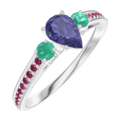« L'ATELIER » NR. 161692Ring Weißgold 375/-(9Kt) - Blauer Saphir Tropfen 0.3 Karat - Seitliche Steine Smaragd - Fassung Rubin