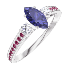 Ring Weißgold 375/-(9Kt) - Blauer Saphir Marquise 0.3 Karat - Seitliche Steine Diamant - Fassung Rubin