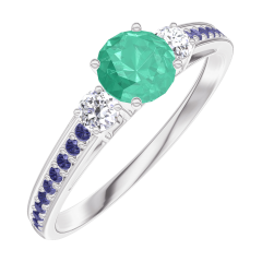 Ring Weißgold 750/-(18Kt) - Smaragd rund 0.3 Karat - Seitliche Steine Diamant - Fassung Blauer Saphir
