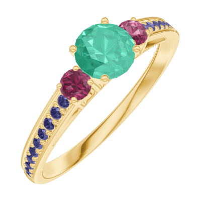 « L'ATELIER » Nº161854Ring Gelbgold 375/-(9Kt) - Smaragd rund 0.3 Karat - Seitliche Steine Rubin - Fassung Blauer Saphir 4.8