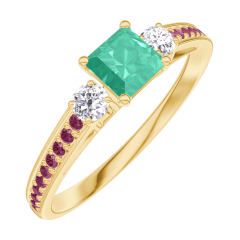 Ring Gelbgold 375/-(9Kt) - Smaragd Prinzess 0.3 Karat - Seitliche Steine Diamant - Fassung Rubin
