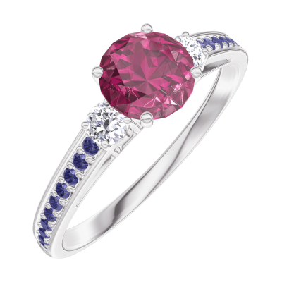 « L'ATELIER » Nº163035Ring Weißgold 750/-(18Kt) - Rubin rund 0.5 Karat - Seitliche Steine Diamant - Fassung Blauer Saphir 4.8