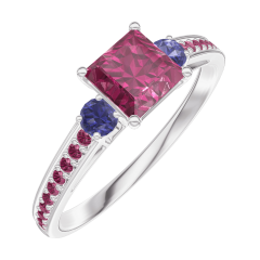 Ring Weißgold 750/-(18Kt) - Rubin Prinzess 0.5 Karat - Seitliche Steine Blauer Saphir - Fassung Rubin