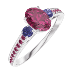 Ring Weißgold 375/-(9Kt) - Rubin Oval 0.5 Karat - Seitliche Steine Blauer Saphir - Fassung Rubin