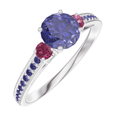 « L'ATELIER » Nº163656Ring Weißgold 375/-(9Kt) - Blauer Saphir rund 0.5 Karat - Seitliche Steine Rubin - Fassung Blauer Saphir 4.9