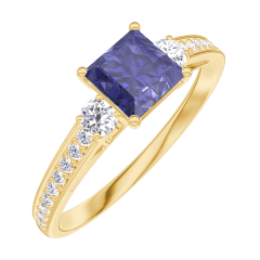 Ring Gelbgold 375/-(9Kt) - Blauer Saphir Prinzess 0.5 Karat - Seitliche Steine Diamant - Fassung Diamant