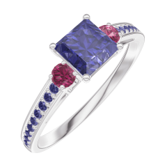 « L'ATELIER » NR. 163756Ring Weißgold 375/-(9Kt) - Blauer Saphir Prinzess 0.5 Karat - Seitliche Steine Rubin - Fassung Blauer Saphir