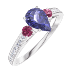 Ring Weißgold 750/-(18Kt) - Blauer Saphir Tropfen 0.5 Karat - Seitliche Steine Rubin - Fassung Diamant