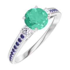 Ring Weißgold 375/-(9Kt) - Smaragd rund 0.5 Karat - Seitliche Steine Diamant - Fassung Blauer Saphir