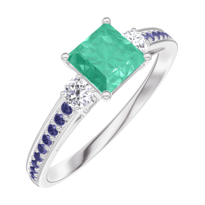 « L'ATELIER » Nº164336Ring Weißgold 375/-(9Kt) - Smaragd Prinzess 0.5 Karat - Seitliche Steine Diamant - Fassung Blauer Saphir
