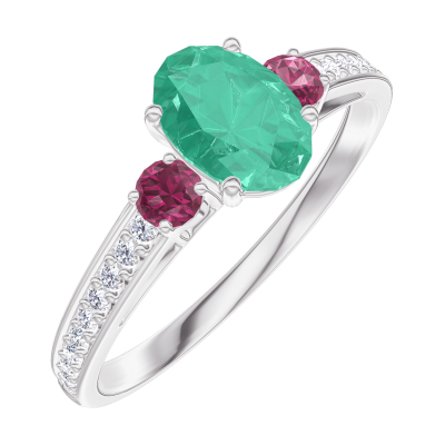 « L'ATELIER » Nº164548Ring Weißgold 375/-(9Kt) - Smaragd Oval 0.5 Karat - Seitliche Steine Rubin - Fassung Diamant