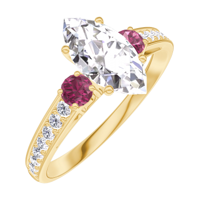 « L'ATELIER » Nº165345Ring Gelbgold 750/-(18Kt) - Diamant Marquise 0.7 Karat - Seitliche Steine Rubin - Fassung Diamant
