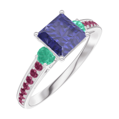 « L'ATELIER » NR. 166192Ring Weißgold 375/-(9Kt) - Blauer Saphir Prinzess 0.7 Karat - Seitliche Steine Smaragd - Fassung Rubin