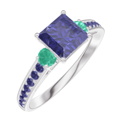 Ring Weißgold 375/-(9Kt) - Blauer Saphir Prinzess 0.7 Karat - Seitliche Steine Smaragd - Fassung Blauer Saphir