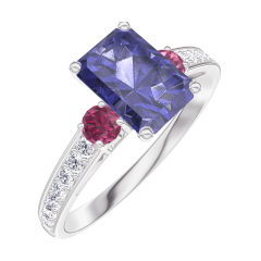 « L'ATELIER » NR. 166248Ring Weißgold 375/-(9Kt) - Blauer Saphir Rechteckig 0.7 Karat - Seitliche Steine Rubin - Fassung Diamant