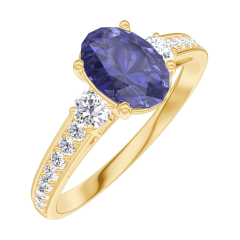 Ring Gelbgold 750/-(18Kt) - Blauer Saphir Oval 0.7 Karat - Seitliche Steine Diamant - Fassung Diamant