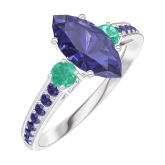 Ring Weißgold 375/-(9Kt) - Blauer Saphir Marquise 0.7 Karat - Seitliche Steine Smaragd - Fassung Blauer Saphir
