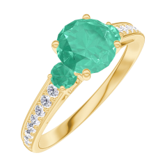 Ring Gelbgold 375/-(9Kt) - Smaragd rund 0.7 Karat - Seitliche Steine Smaragd - Fassung Diamant