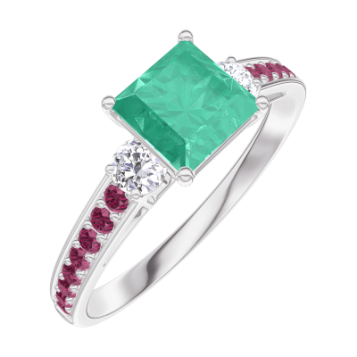 « L'ATELIER » Nº166732Ring Weißgold 375/-(9Kt) - Smaragd Prinzess 0.7 Karat - Seitliche Steine Diamant - Fassung Rubin