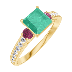 Ring Gelbgold 750/-(18Kt) - Smaragd Prinzess 0.7 Karat - Seitliche Steine Rubin - Fassung Diamant