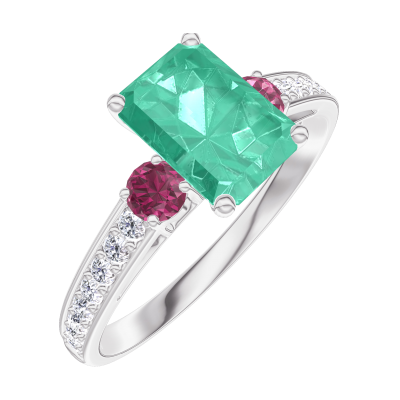 « L'ATELIER » Nº166848Ring Weißgold 375/-(9Kt) - Smaragd Rechteckig 0.7 Karat - Seitliche Steine Rubin - Fassung Diamant