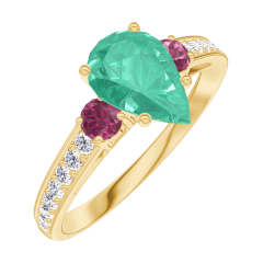 Ring Gelbgold 750/-(18Kt) - Smaragd Tropfen 0.7 Karat - Seitliche Steine Rubin - Fassung Diamant