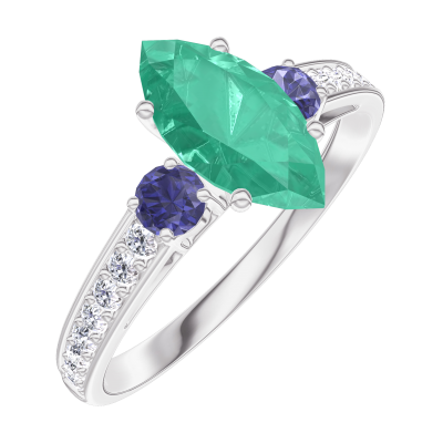 « L'ATELIER » Nº167167Ring Weißgold 750/-(18Kt) - Smaragd Marquise 0.7 Karat - Seitliche Steine Blauer Saphir - Fassung Diamant
