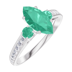 Ring Weißgold 375/-(9Kt) - Smaragd Marquise 0.7 Karat - Seitliche Steine Smaragd - Fassung Diamant