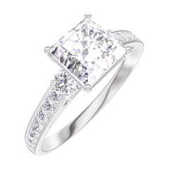 Ring Weißgold 375/-(9Kt) - Diamant Prinzess 1 Karat - Seitliche Steine Diamant - Fassung Diamant