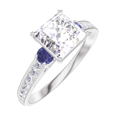 « L'ATELIER » Nº167368Ring Weißgold 375/-(9Kt) - Diamant Prinzess 1 Karat - Seitliche Steine Blauer Saphir - Fassung Diamant