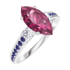 Ring Weißgold 750/-(18Kt) - Rubin Marquise 1 Karat - Seitliche Steine Diamant - Fassung Blauer Saphir