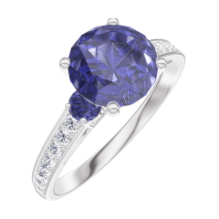 Ring Weißgold 750/-(18Kt) - Blauer Saphir rund 1 Karat - Seitliche Steine Blauer Saphir - Fassung Diamant