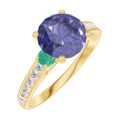 Ring Gelbgold 375/-(9Kt) - Blauer Saphir rund 1 Karat - Seitliche Steine Smaragd - Fassung Diamant