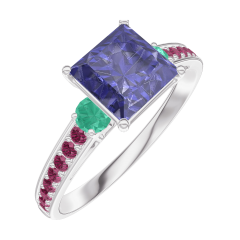 Ring Weißgold 750/-(18Kt) - Blauer Saphir Prinzess 1 Karat - Seitliche Steine Smaragd - Fassung Rubin