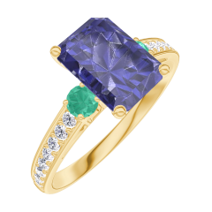 Ring Gelbgold 375/-(9Kt) - Blauer Saphir Rechteckig 1 Karat - Seitliche Steine Smaragd - Fassung Diamant