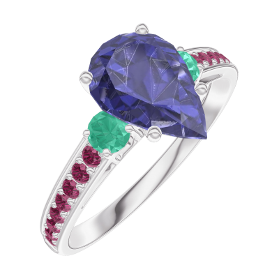 « L'ATELIER » Nº168892Ring Weißgold 375/-(9Kt) - Blauer Saphir Tropfen 1 Karat - Seitliche Steine Smaragd - Fassung Rubin