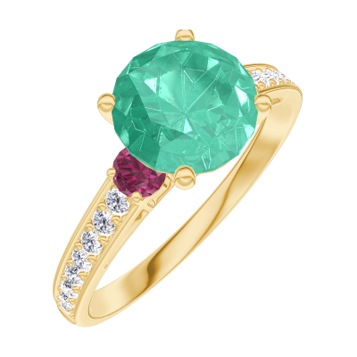 « L'ATELIER » NR. 169046Ring Gelbgold 375/-(9Kt) - Smaragd rund 1 Karat - Seitliche Steine Rubin - Fassung Diamant 4.9