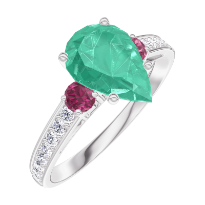 « L'ATELIER » Nº169448Ring Weißgold 375/-(9Kt) - Smaragd Tropfen 1 Karat - Seitliche Steine Rubin - Fassung Diamant