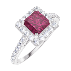 Ring Weißgold 375/-(9Kt) - Rubin Prinzess 0.5 Karat - Halo Diamant - Fassung Diamant
