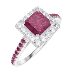 Ring Weißgold 375/-(9Kt) - Rubin Prinzess 0.5 Karat - Halo Diamant - Fassung Rubin